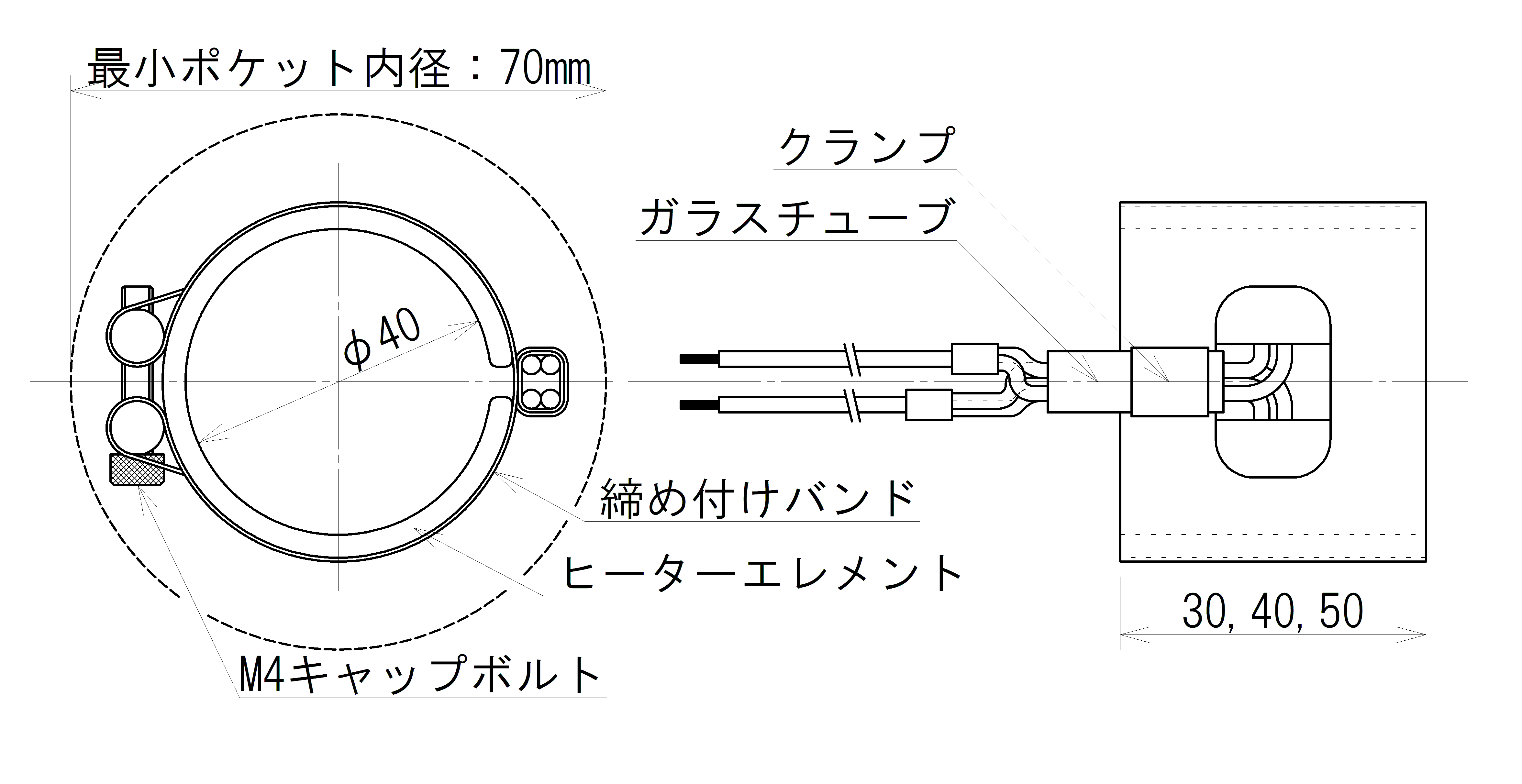 | 内径 | ヒーター幅 | 電圧 | ヒーター容量 | ワット密度 |