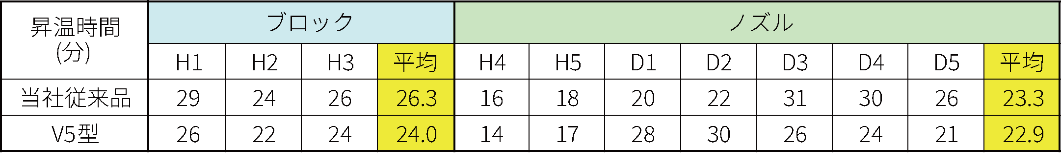 ノズル内の熱を均一につたえることで適正なヒーター数を実現します。